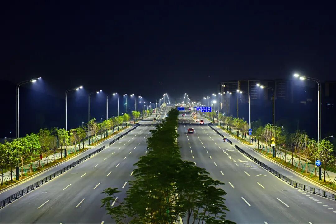 新花大道(花都大道-商业大道)主线运用高杆节能照明灯并配备智能控制系统,可以实现对路灯的整体控制;与花都大道交接的匝道处使用护栏灯,光亮但不刺眼。近看,光影柔和,勾勒出道路的流畅线条;远望,则成一幅浩然的夜色画卷:天幕蓝韵静谧,道路铺展为车流有序的金色光河,周边楼宇灯火如星辰散落,三者交融——天际沉静、道路川流、建筑闪烁,共同呈现出花都深稳澎湃的新气象。